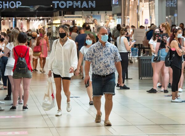 Shoppers wear masks at a mall on the third day of Quebec's mandatory mask order for all indoor public spaces on July 20, 2020 in Laval, Que.Ryan Remiorz/The Canadian Press