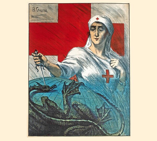 A nurse stabbing a dragon that holds the globe in its claws; representing assistance to the tuberculous from the Italian Red Cross. Colour lithograph by B. Cascella, ca. 1920. Cascella, Basilio, 1860-1950.Detail of a poster by Basilio Cascella, ca. 1920/WELLCOME COLLECTION