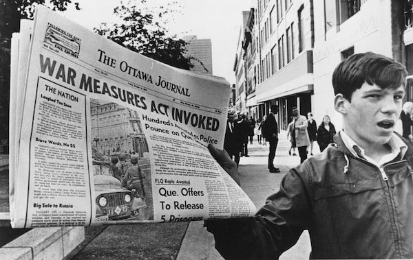 Ottawa, Oct. 16, 1970: A newsboy holds up a copy of The Ottawa Journal reporting that, for the first time in peacetime, the federal government had invoked the War Measures Act to deal with a hostage crisis involving the Front de libération du Québec.The Canadian Press