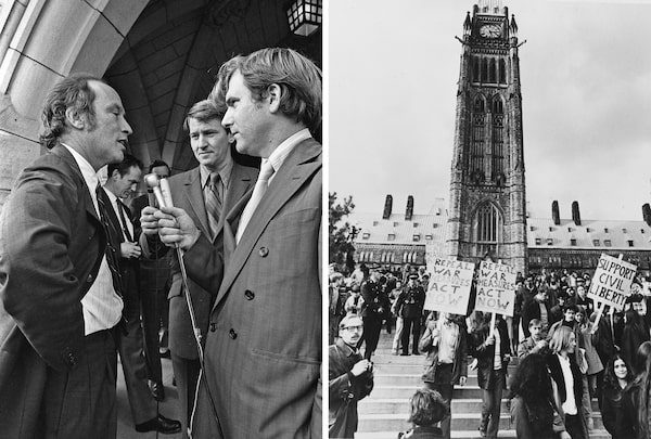 At left, prime minister Pierre Trudeau speaks with reporters Peter Reilly and Tim Ralphe on Oct. 13, the exchange where, when asked how far he would go against the FLQ, Mr. Trudeau said 'just watch me.' Five days later, at left, protesters denounce the War Measures Act as a step too far.Photos: The Canadian Press