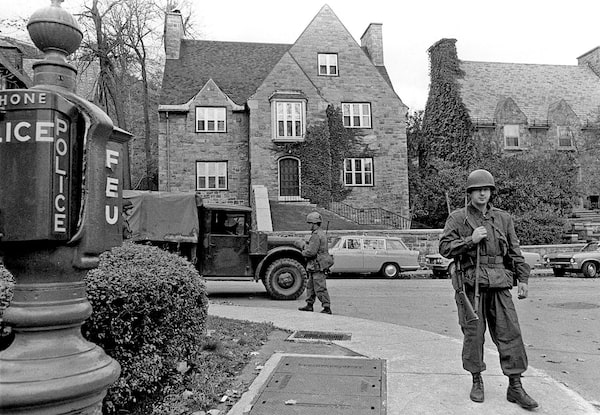 Soldiers stand guard at the Montreal home of James Cross, the British trade commissioner, on Oct. 16, 1970, the first day that the War Measures Act took effect.