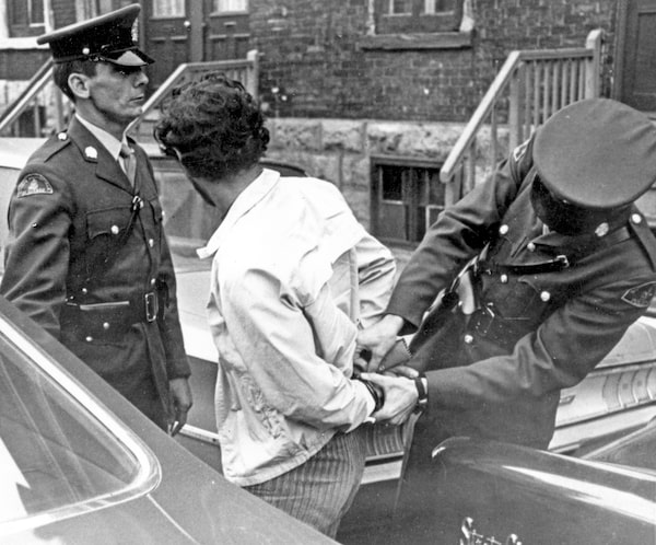 A Quebec provincial police officer handcuffs a young man in one of the first War Measures Act raids on Oct. 16.The Canadian Press