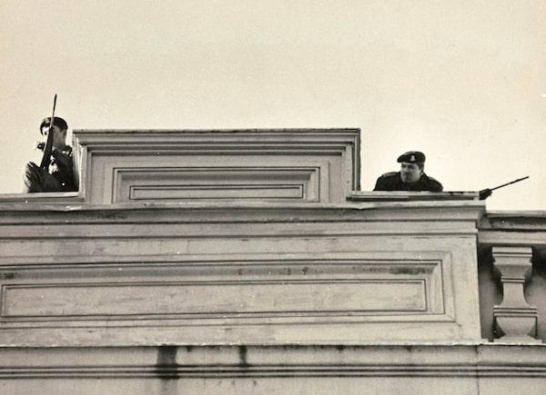 Soldiers stand guard on the roof of a Montreal courthouse on Oct. 20, where Pierre Laporte's body was lying in state before a funeral at Notre Dame Basilica.Dennis Robinson/The Globe and Mail