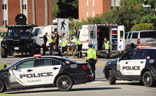 Police officers and paramedics survey the area of a shooting in Fredericton, N.B. on August 10, 2018.Keith Minchin/The Canadian Press