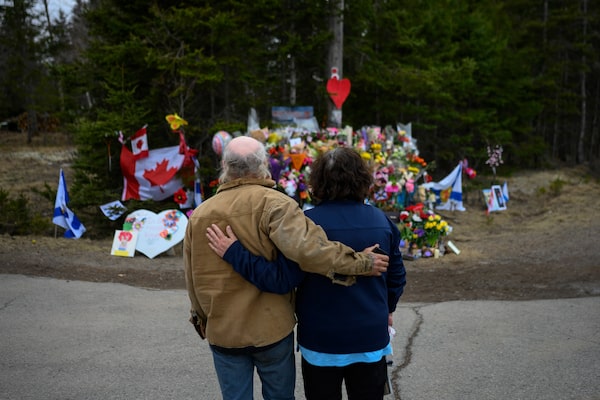 Scott Paul, left, and Jane Benvie embrace in Portapique, N.S. on April 24, 2020 where a local memorial has begun for those killed by a gunman last weekend.Darren Calabrese/The Globe and Mail