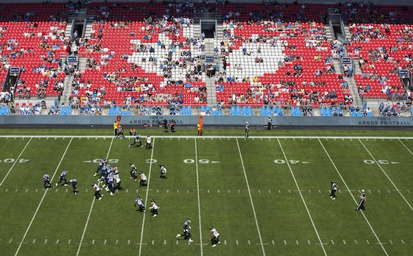 The stands are sparsely filled as the Toronto Argonauts and Hamilton Tiger-Cats play during the first half of CFL football preseason action, at the first ever CFL football game played at BMO Field, in Toronto on June 11, 2016.Mark Blinch/The Canadian Press