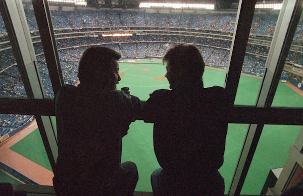 In this Oct. 22, 1992, file photo, spectators look out at the field of the SkyDome in Toronto, from a window of the SkyDome Hotel before Game 5 of the World Series between the Toronto Blue Jays and the Atlanta Braves.Rusty Kennedy/The Associated Press