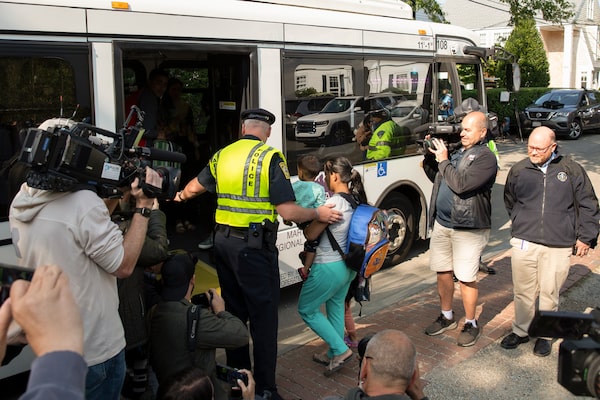 Migrant families are loaded onto a bus that will take them to the ferry, on Martha’s Vineyard in Edgartown, Mass. on Sept. 16. Migrants shipped to Martha’s Vineyard by Florida’s Republican governor said on Friday that they had been misled about where they were being taken.MATT COSBY/The New York Times News Service