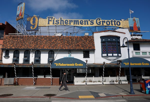 A pedestrian walks by the closed Fisherman's Grotto restaurant at Fisherman's Wharf on May 2, in San Francisco. Foreign tourism to California fell sharply in February and March during the first 100 days of Donald Trump's second term in the White House.Justin Sullivan/Getty Images