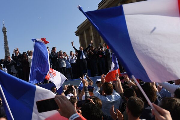 Macron supporters wave French and European flags in Nanterre on April 2. Last time around, in 2017, Mr. Macron won 66 per cent of the popular vote on the second ballot.LUDOVIC MARIN/AFP via Getty Images
