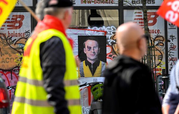 A poster shows a bruised Emmanuel Macron in Paris on March 24. Mr. Macron is running for re-election as France's president this month; the first-round vote is on April 10, with a second on April 24.EMMANUEL DUNAND/AFP via Getty Images