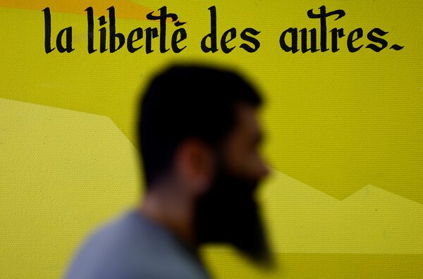 A leader of the mosque association in Allonnes, France, passes a mural reading 'the freedom of others.'Stephane Mahe/Reuters