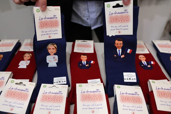 Maxime Lemersre, owner of the Chaussettes et compagnie store in Lille, shows socks featuring Ms. Le Pen and Mr. Macron.Pascal Rossignol/Reuters