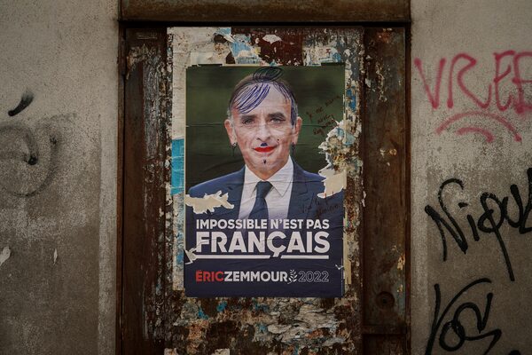 Defaced posters of presidential candidates Marine Le Pen and Éric Zemmour.Gonzalo Fuentes/Reuters; Laurent Cipriani/AP