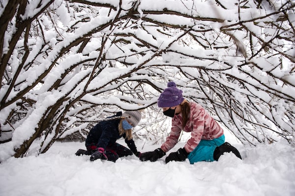 Children play under the branches of a bush during a Jan. 16 snowstorm in Ottawa.Justin Tang/The Canadian Press
