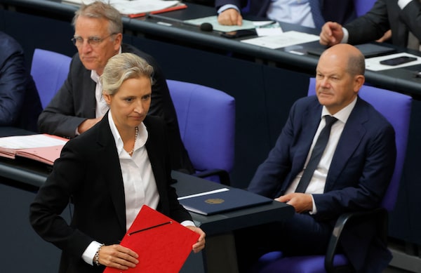 German Chancellor Olaf Scholz (R) looks on as Alice Weidel, co-leader of the far-right Alternative for Germany (AfD) party and also her party's parliamentary group co-leader, arrives to give a speech on June 22 at the Bundestag in Berlin, ahead of the EU summit.ODD ANDERSEN/AFP/Getty Images