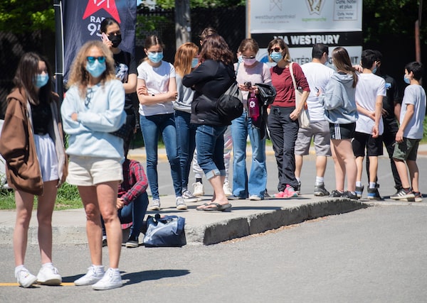 People wait in line to receive a COVID-19 vaccine shot at the Bill-Durnan COVID-19 vaccination site in Montreal, May 24, 2021.Graham Hughes/The Canadian Press