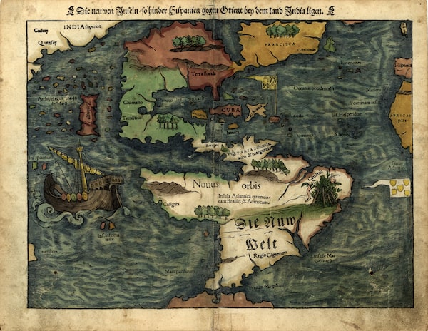 A 16th century map of the Western Hemisphere by Sebastian Münster from Basel, Switzerland. South America is labeled in German. Geographic features otherwise in Latin. Appears in the author's Cosmographei.Library of Congress