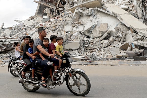 Palestinians ride a motorcycle past the site of an Israeli air strike, after Israel-Hamas truce, in Gaza May 21, 2021.SUHAIB SALEM/Reuters