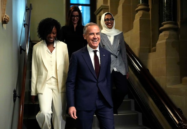 Prime Minister Mark Carney walks with Liberal MPs Tatiana Auguste, left, Danielle Martin and Doly Begum as they make their way to a meeting of the Liberal caucus in Ottawa on Wednesday.Justin Tang/The Canadian Press