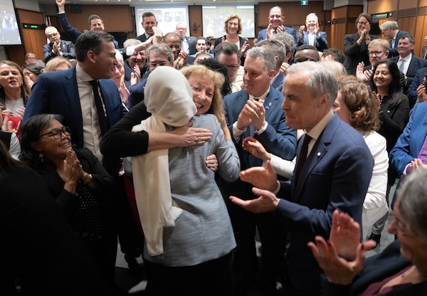 MP for Sarnia-Lambton-Bkejwanong Marilyn Gladu hugs MP for Scarborough Southwest Doly Begum as Carney welcomes newly elected members to caucus.Adrian Wyld/The Canadian Press