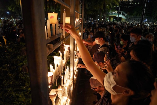 People light candles at a vigil in Victoria Park in Hong Kong on June 4, 2020, after the annual remembrance for the 1989 Tiananmen Square crackdown was banned on public health grounds during the pandemic.YAN ZHAO/AFP/Getty Images