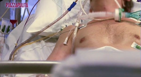 A coronavirus patient is treated in an intensive care unit at the Cremona hospital in northern Italy, in this still image taken from video, on March 5, 2020.LA7 PIAZZAPULITA/Reuters