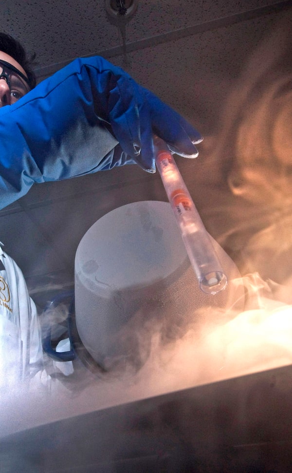 A nitrogen-filled freezer used for storing sperm and eggs at a fertility lab in Vancouver, March 31, 2010. Anecdotal reports and incomplete data suggest that the number of intended parents from outside Canada has been growing in recent years.JOHN LEHMANN/The Globe and Mail