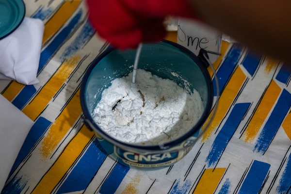 A Sinaloa cartel cook massages blue dye into a bucket of fentanyl powder in Culiacan, December, 2024. For drug traffickers in Mexico, discovering fentanyl meant they could exploit North America’s opioid epidemic with the kind of supply that was never possible with heroin.MERIDITH KOHUT/The New York Times News Service