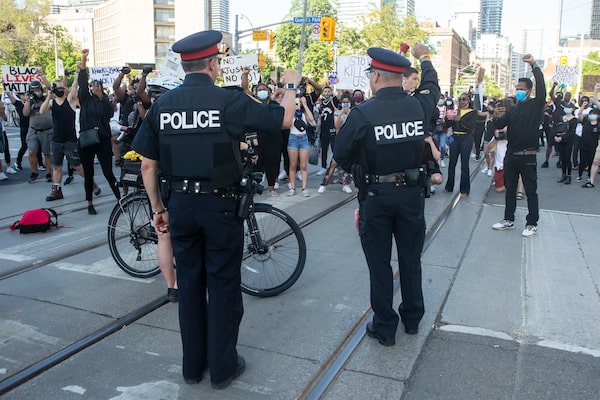 Police officers look on as protesters march in an anti-racism rally in Toronto on June 6, 2020.Chris Young/The Canadian Press