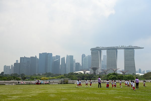 Children play in a Singapore park in front of the city skyline. Boosters of the republic contend that it has left the developing world behind and matured into an economic powerhouse.ROSLAN RAHMAN/AFP/Getty Images