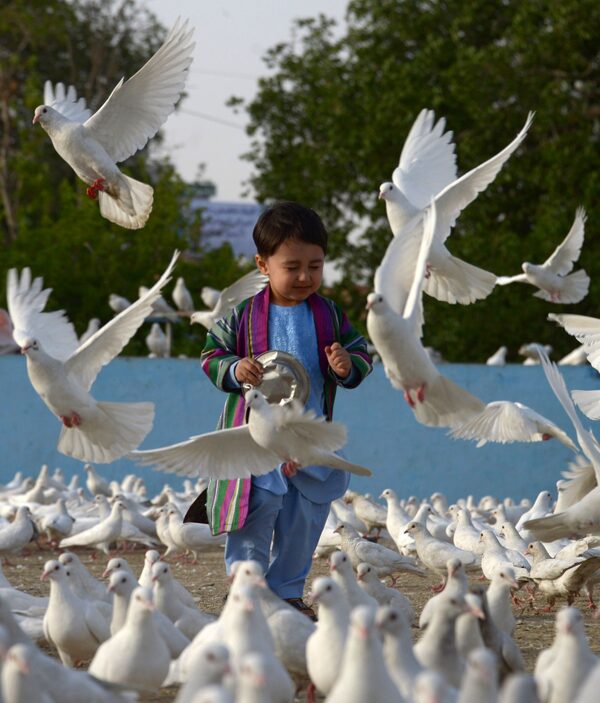 An Afghan child stands amid the pigeons flying in the courtyard of Mazar-e Sharif's Blue Mosque in 2018.FARSHAD USYAN/AFP/Getty Images