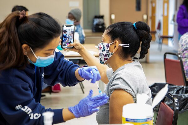 Ramona Ramos takes a selfie as a nurse from Humber River Hospital's mobile vaccination clinic administers the first dose of the Moderna COVID-19 vaccine at a Toronto Community Housing building in Toronto on April 13, 2021.CARLOS OSORIO/Reuters