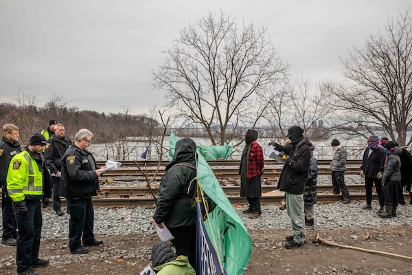Police read protesters an injunction order as they block rail lines in Hamilton, Ontario, in response to the Wet'suwet'en and Tyendinaga protests, Feb. 25, 2020.Brett Gundlock/The Globe and Mail