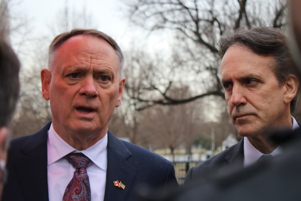 Public Safety Minister David McGuinty, left, and Canada's fentanyl czar Kevin Brosseau speak to reporters outside the White House in Washington, on Feb. 27.Kelly Geraldine Malone/The Canadian Press