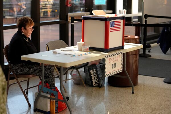A poll worker is seated near a ballot box during early voting in the general election, on Nov. 1, in Fall River, Mass.Steven Senne/The Associated Press