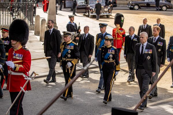 King Charles III with other members of the Royal Family follow the procession of the State Gun Carriage of Queen Elizabeth on Sept. 19.POOL/Reuters