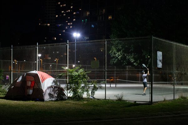A man plays tennis next to an homeless encampment in Toronto, on Sept. 23, 2020.Chris Young/The Canadian Press