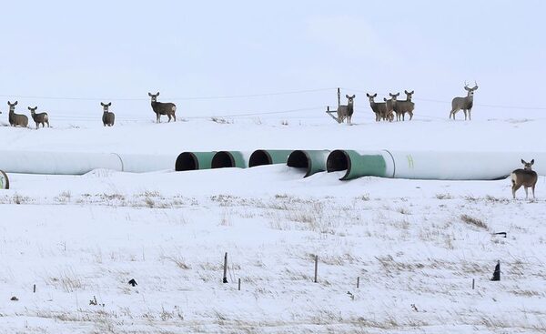 Deer gather at a depot used to store pipes for the planned Keystone XL oil pipeline in Gascoyne, North Dakota on Jan. 25, 2017.Terray Sylvester/Reuters