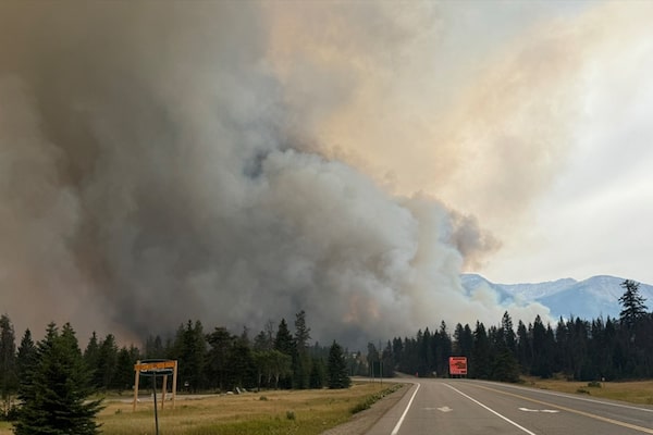 A wildfire burns in Jasper National Park in this Wednesday, July 24, 2024 handout photo from the Jasper National Park Facebook page.HO/The Canadian Press