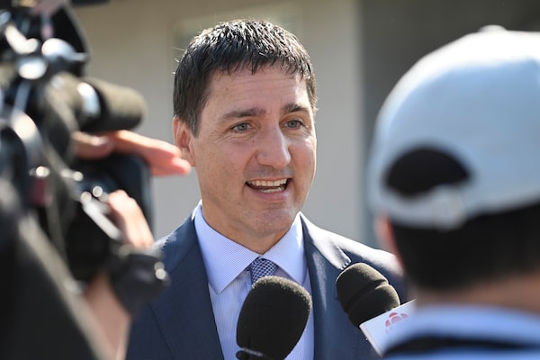 Prime Minister Justin Trudeau talks to media outside the Basilica of Sainte-Anne de Beaupré, east of Quebec City, during the papal visit of Pope Francis, on July 28.Bernard Brault/The Canadian Press