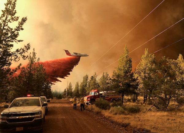 A firefighting tanker making a retardant drop over the Grandview Fire near Sisters, Ore., July 11, 2021.The Associated Press