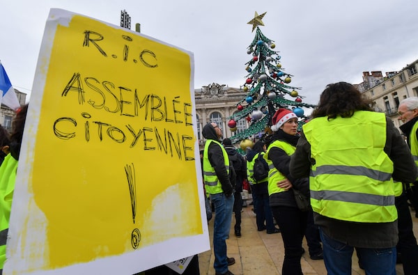 French protesters call for a citizens’ assembly during a 2018 “Yellow Vest” demonstration against President Emmanuel Macron’s policies in Montpellier.PASCAL GUYOT/AFP/Getty Images