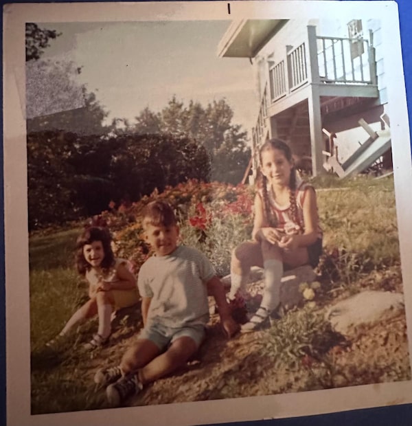 Jiddo's grandchildren sit in the side flower garden at the home on Lynwood Drive, including author Paula Arab at far left.Supplied
