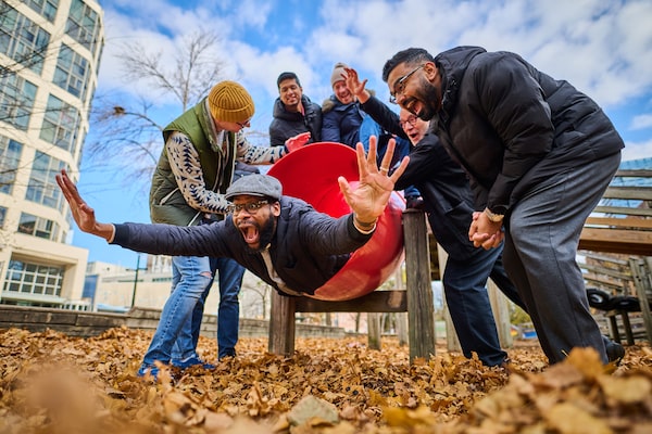 Research has shown that at a young age, boys maintain intimate friendships with one another – but by their teenage years, that's no longer the case. A staged photo of men, including Globe staff, playing in a children's playground.Sammy Kogan/The Globe and Mail