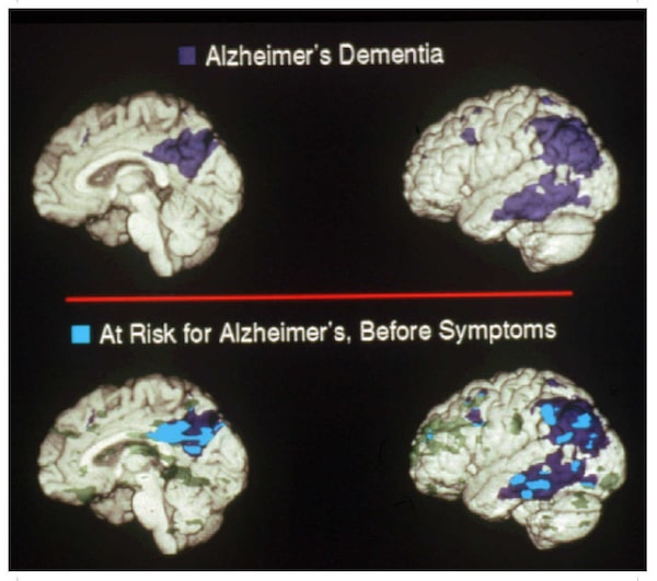 Brain scan images showing Alzheimer's dementia, top in dark blue, compared to another scan with early developing spots, in light blue, that researchers said were likely showing the early stages of Alzheimer's disease. The results of the research were published in the new England Journal of Medicine in 1996.The Associated Press