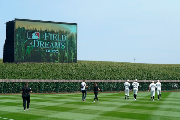 Chicago White Sox players walk on the field before a baseball game against the New York Yankees in Dyersville, Iowa, on Aug. 12, 2021.Charlie Neibergall/The Associated Press