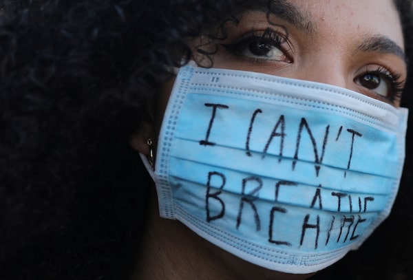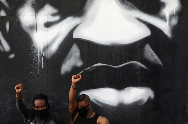 Two men raise their fists on June 2 in front of a mural of George Floyd near the site in Minneapolis where, a week earlier, a white police officer knelt on his neck for nearly nine minutes while he was being arrested. Mr. Floyd died later that night in hospital, and the officer is now charged with second-degree murder. The death triggered protests against anti-Black racism and police brutality across the United States.Leah Millis/Reuters/Reuters