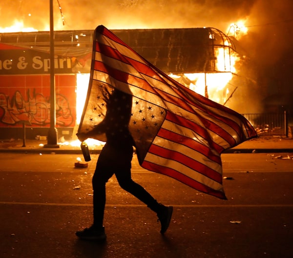 A protester carries a U.S. flag upside down next to a burning building in Minneapolis.Julio Cortez/The Associated Press/The Associated Press
