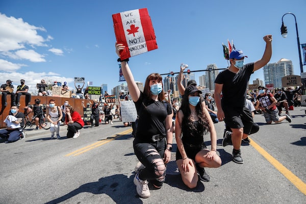 Protesters take a knee at a June 3 solidarity protest in Calgary.Jeff McIntosh/The Canadian Press/The Canadian Press